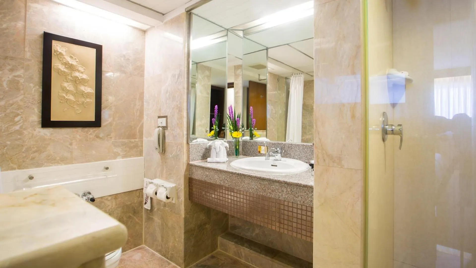 Alcune camere dell'Asia Hotel Bangkok sono dotate di tende oscuranti e un impianto di climatizzazione. Inoltre, dispongono di opzioni per preparare i pasti in autonomia, come un mini bar. Le camere sono progettate in stile spazioso. I bagni, forniti di servizi quali asciugacapelli e accappatoi, sono inoltre equipaggiati con un bagno con WC separato e una doccia. Gli ospiti possono godersi una vista sulla città.